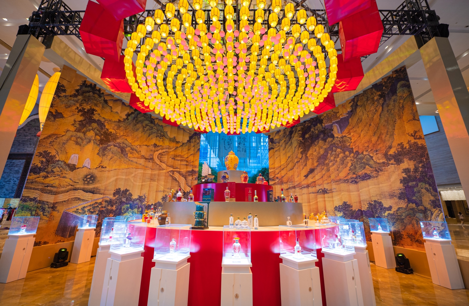 在赓续传承板块,五粮液借酒店中式大堂营造千年酒文化沉浸式氛围感,以川西古建筑风格打造嘉宾签到处,风格鲜明,不拘一格,墙上循环播放的五粮液品牌宣传片,深入人心;由九龙坛、501五粮液、经典五粮液、第八代五粮液以及和美中国、五福熊猫等重磅产品合力打造的产品展台位于酒店大堂“C位”,如众星捧月般夺人眼球;不断旋转的展台,确保观展者可以从不同角度欣赏产品,提升产品观赏性;四周环绕的展柜,展示着从第一代到第八代五粮液,不断赓续传承的品牌发展历程,娓娓道来每一款时代经典背后浓墨重彩的五粮液发展篇章。