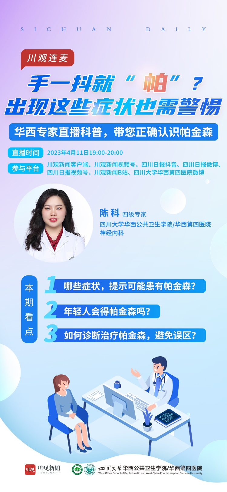 4月11日(周二)19:00—20:00,川观新闻携手四川大学华西公共卫生学院/华西第四医院开展直播连麦,从帕金森病预防、治疗、康复照料等一系列问题入手,给出科学、实用的指导意见,为您答疑解惑。
