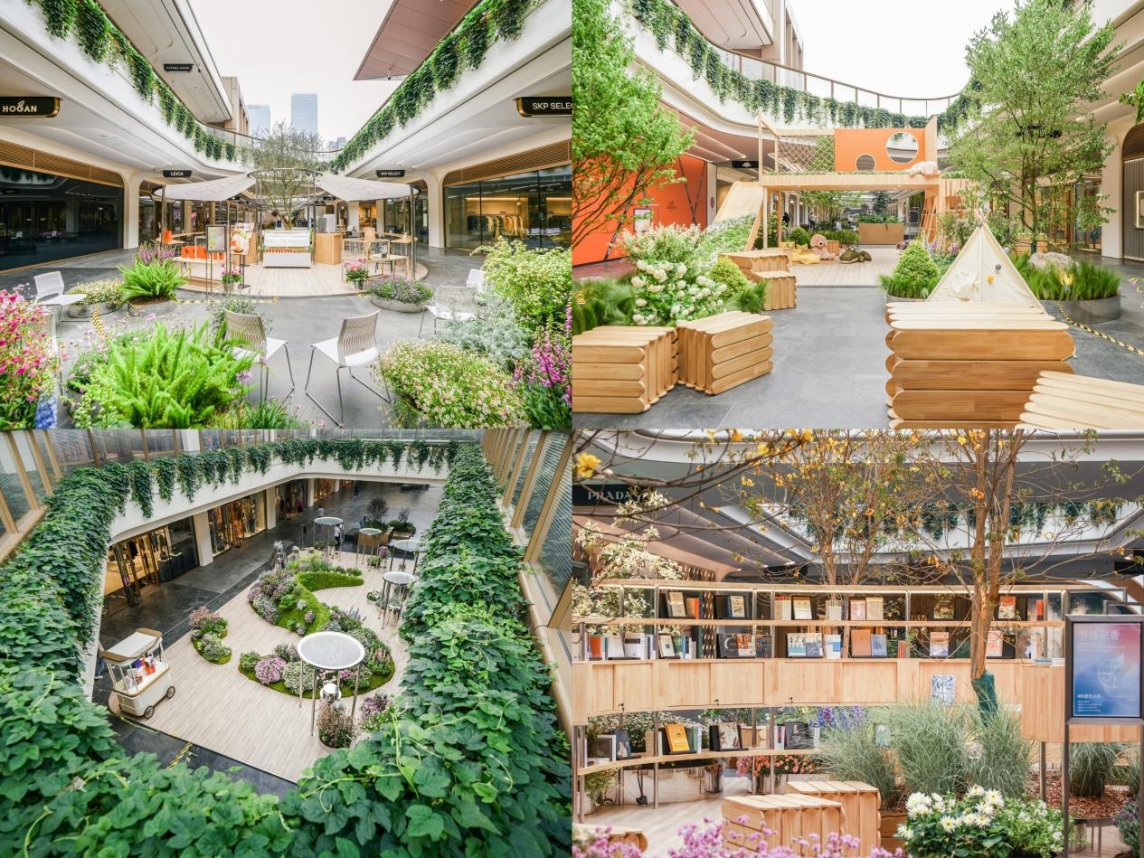 现场,地面公园层还有紫藤花和杜鹃花组成的展览,联动场内“万物生”艺术橱窗,以及“K大道”之中的四座“繁花市集”——成都SKP“变身”城市春日花园:生机盎然的各类鲜花与植物品种,各类品牌展示,商品推广,体验互动,结合园林艺术的造景贯穿一体。