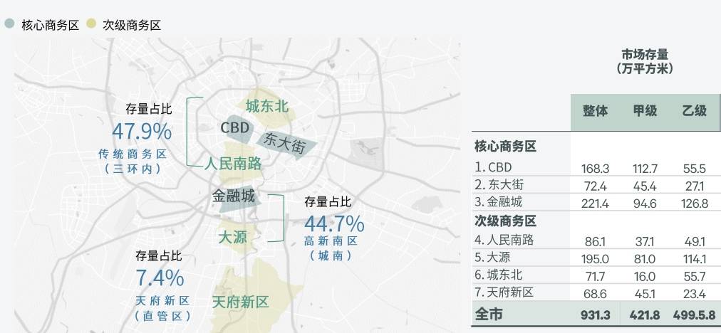 成都写字楼市场存量及分布情况。图据世邦魏理仕