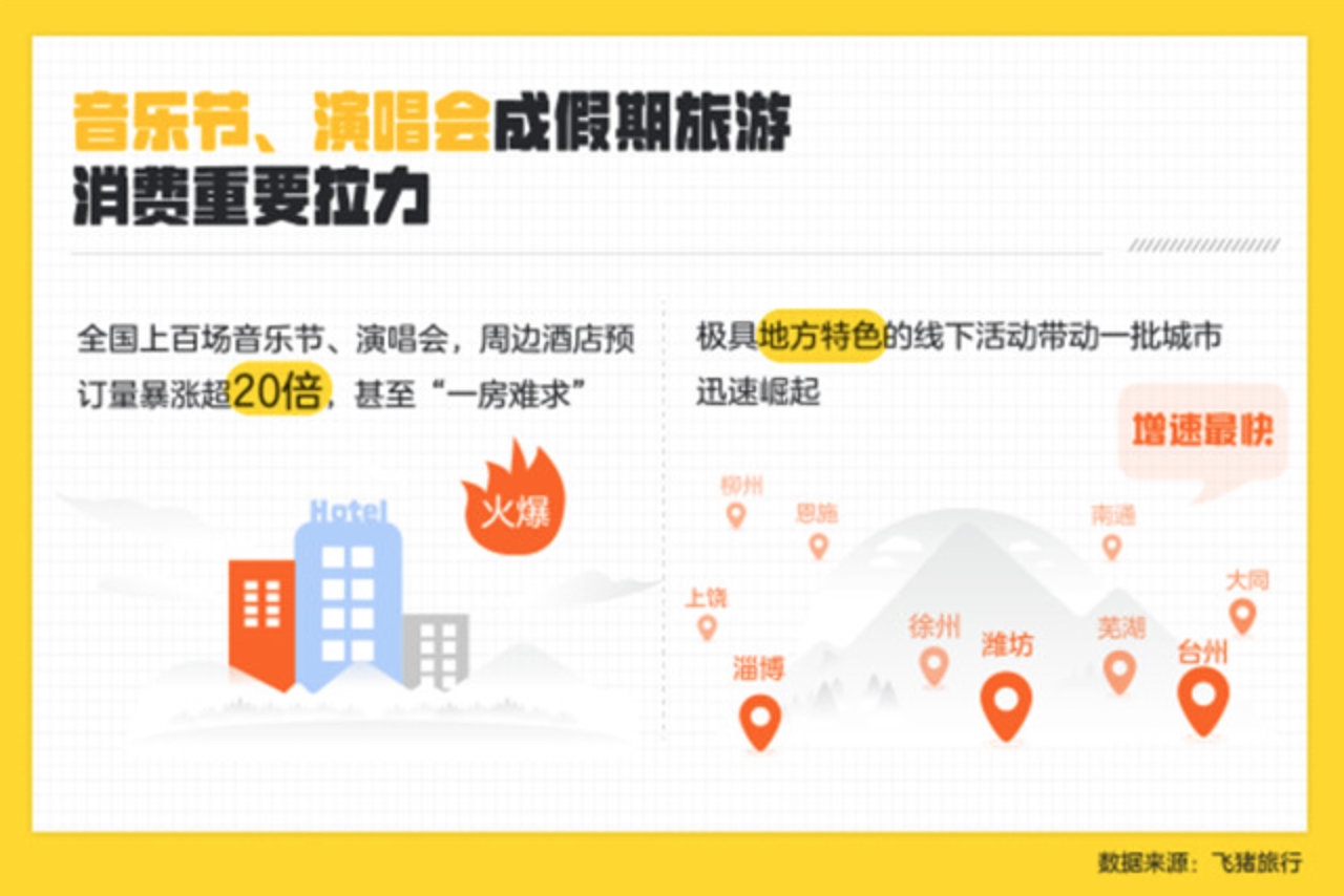 “旅行+演艺”活动体验,在今年“五一”假期也备受消费者欢迎。一场久违的热闹演出,成为小长假“酷旅行”的标志。据飞猪统计,五一假期前后,全国各地将举办上百场演唱会、音乐节。五一假期演唱会、音乐节所在地周边的酒店预订量同比暴增超20倍,部分热门酒店甚至“一房难求”。