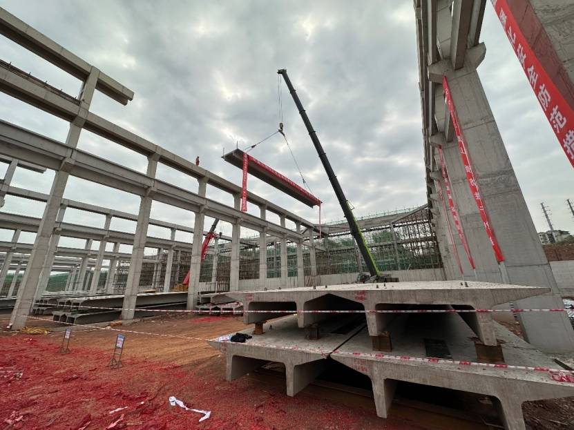 “精确安装,重中之重。”项目总工程师张进介绍,长度24米的双T板,有风的情况下会存在比较大的位移,为了确保吊装安全稳定,该项目采用起重180吨的汽车吊,对其进行逐跨吊装。汽车吊间隔16米移位一次,站位一次吊装3块双T板,梁顶弹线标记保证精度,吊装过程中组织专职安全员、技术员在现场督导,以确保双T板安全精确吊装。