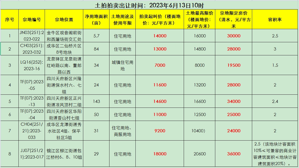 6月13日 成都中心城区将有8宗地拍卖出让