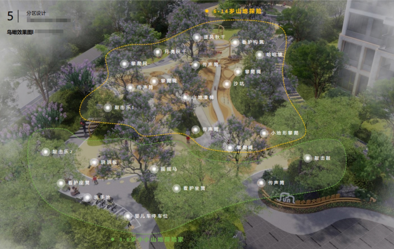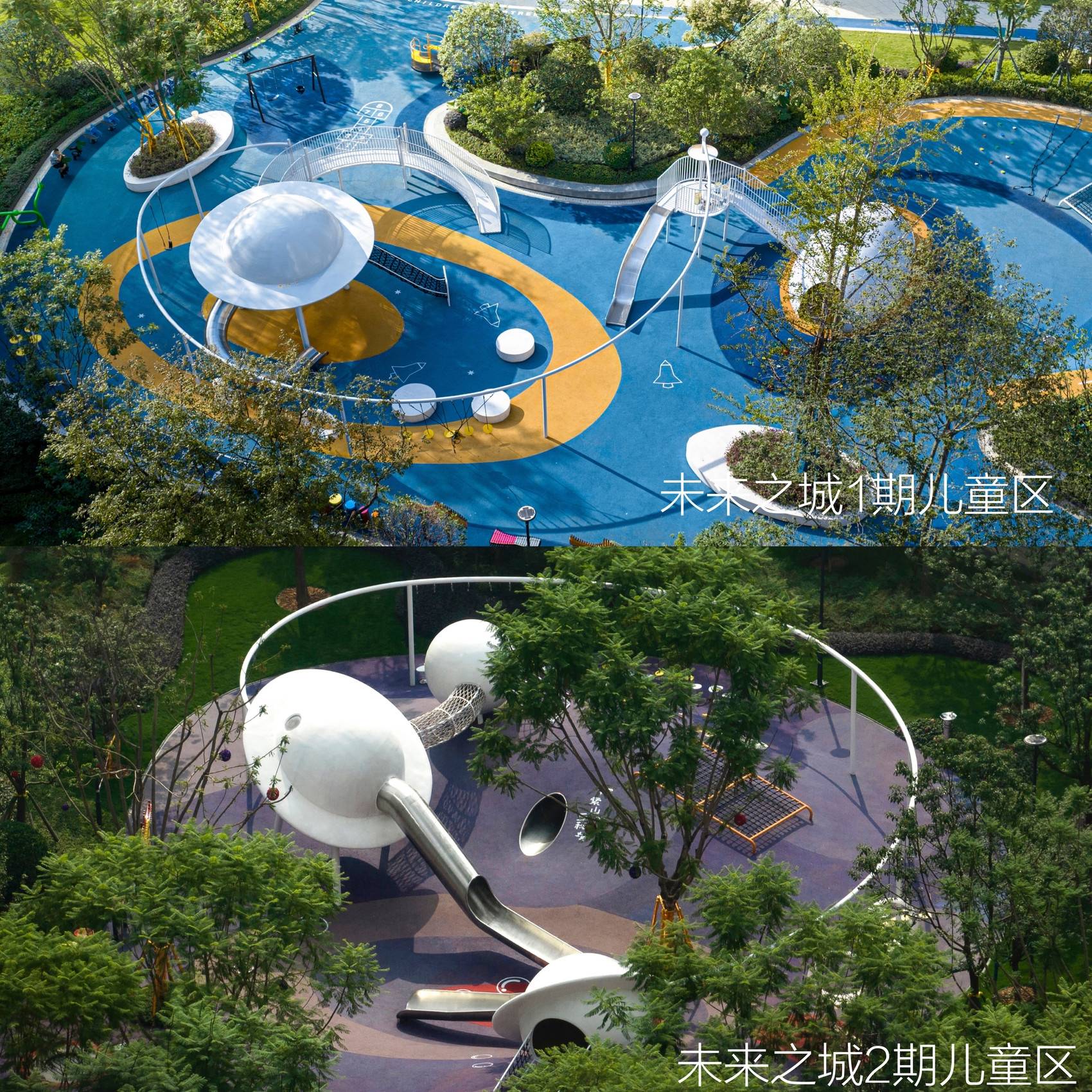 在2022年底亮相销售的天府九里项目,儿童乐园的设计则以山地探险为主题,融入更多自然元素。整个儿童场地计划以蓝花楹为主,搭配灌木,周围用花乔围合,在这里,孩子们可以用脚步感受大地,用眼睛观察世界,用双手去触摸自然,全面培养感知力。