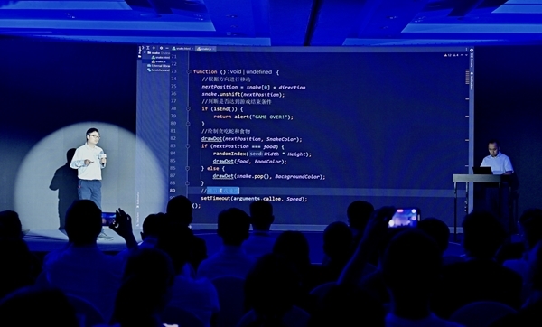 会上,百度智能云AI平台副总经理施恩还对“Comate”进行了现场演示,通过“Comate”现场快速开发“贪吃蛇”小游戏。开发者只需输入“canvas”,以及“弹性布局,水平居中,垂直居中”等中文备注,“Comate”即可自动识别语义,生成游戏画布代码。再输入“param color”、“left”、”food=”等关于颜色、方向、食物的简单词汇,“Comate”自动联系上下文理解指令,补全代码,并在多条推荐代码之间切换,选择合适代码,直接生成可运行的“贪吃蛇”小游戏。