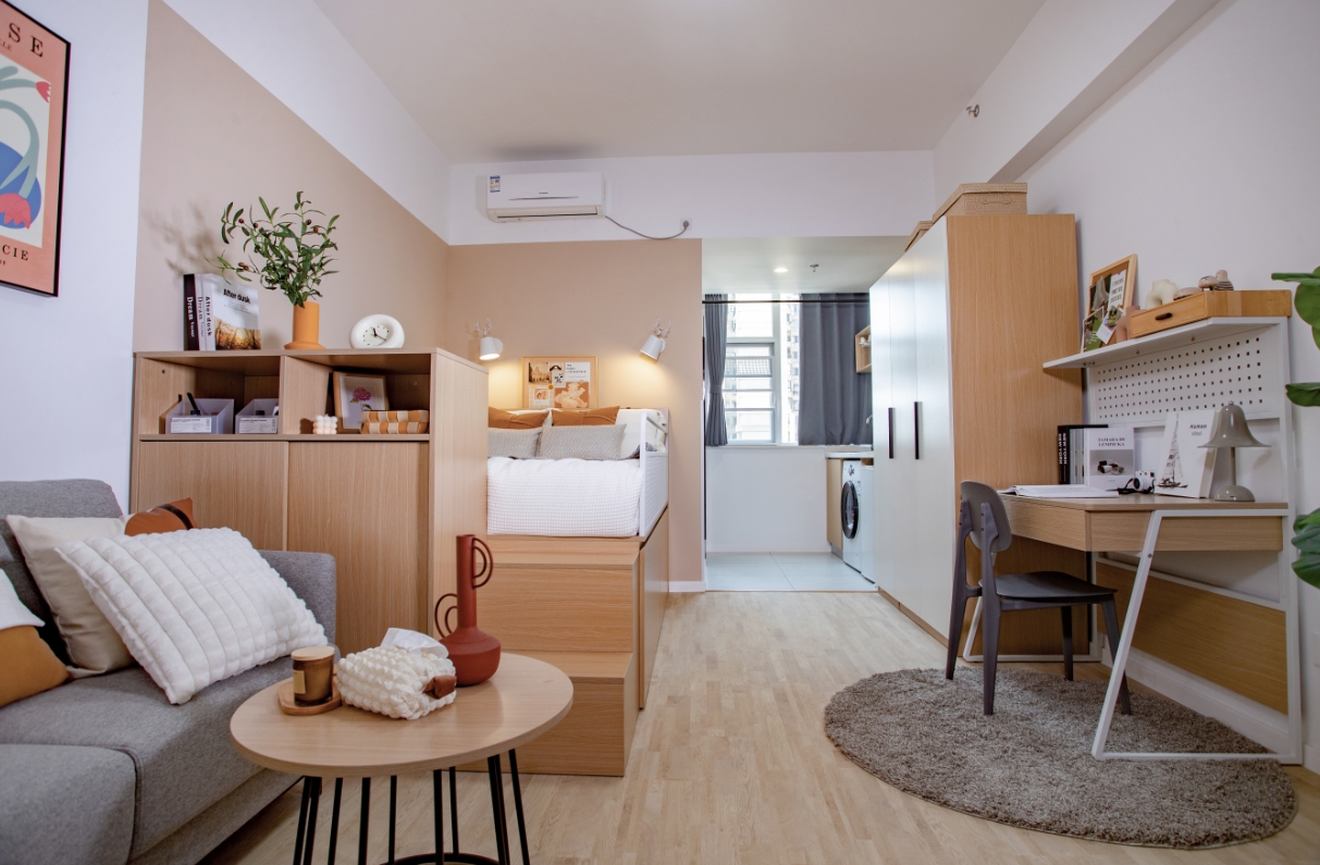 米咖户型无疑是海盐公寓的“储藏王”,抬高的床体下是高达1800L的储藏空间,可以放冬季的棉被、厚衣服等,沙发旁的1米侧柜设计为滑轨柜门,可以收纳零食杂物等。对于书籍多、衣服多的租客,无疑是最好的选择。