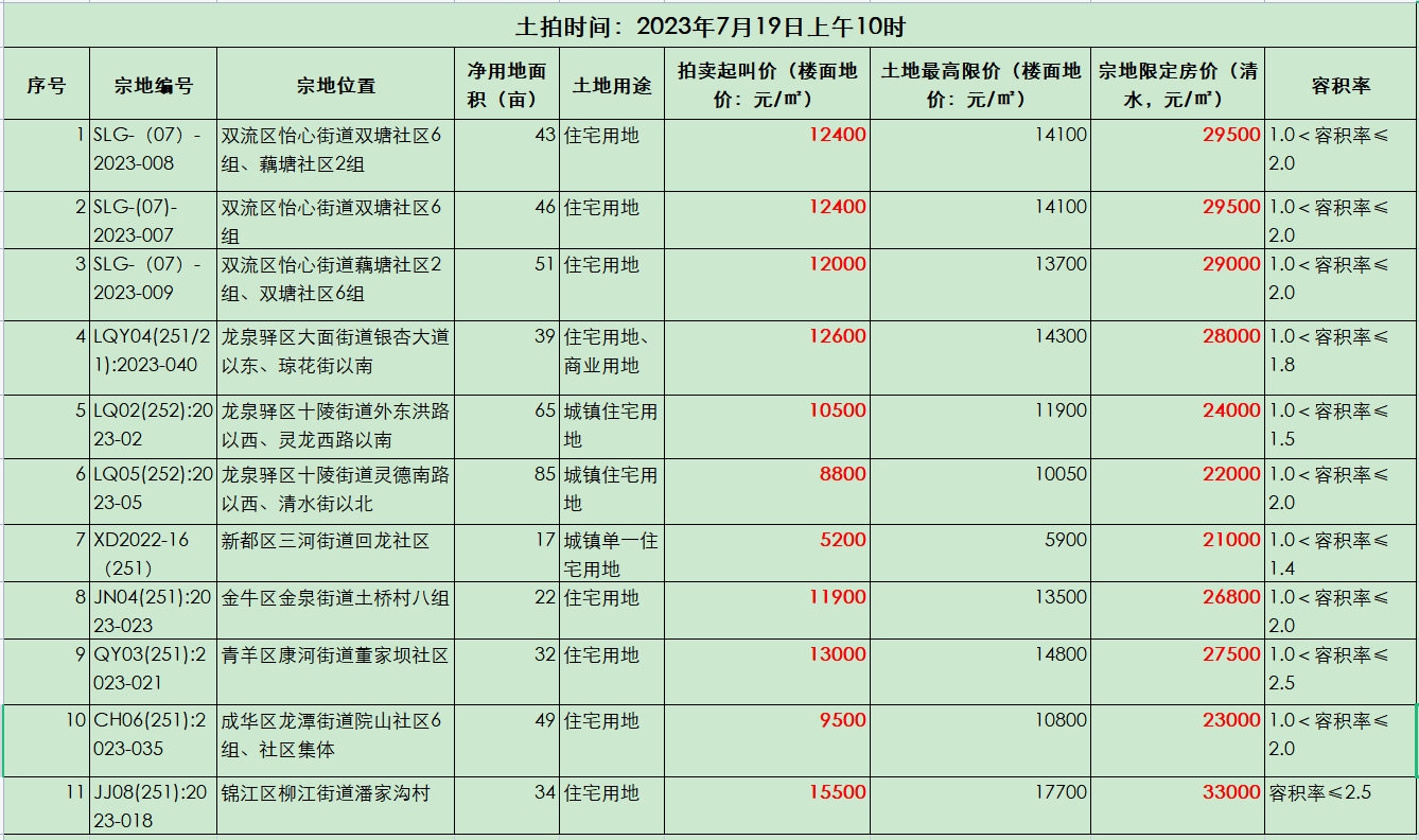 日前,成都市公共资源交易服务中心发布土拍公告,7月19日上午10点,成都中心城区将拍卖11宗涉宅用地,合计出让面积约483亩。从出让宗地位置来看,其中双流区3宗、龙泉驿区3宗、新都区、成华区、锦江区、金牛区和青羊区各1宗。