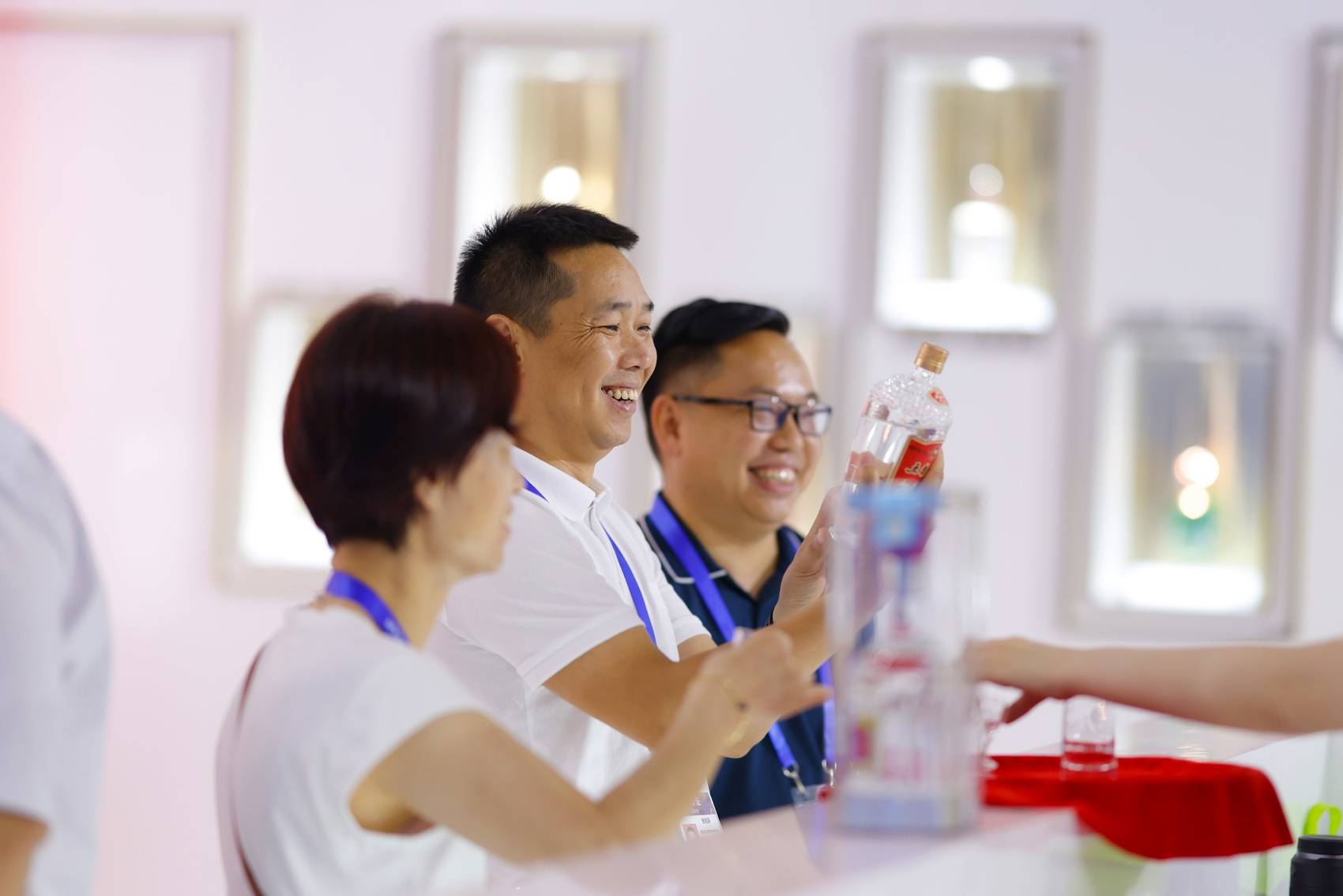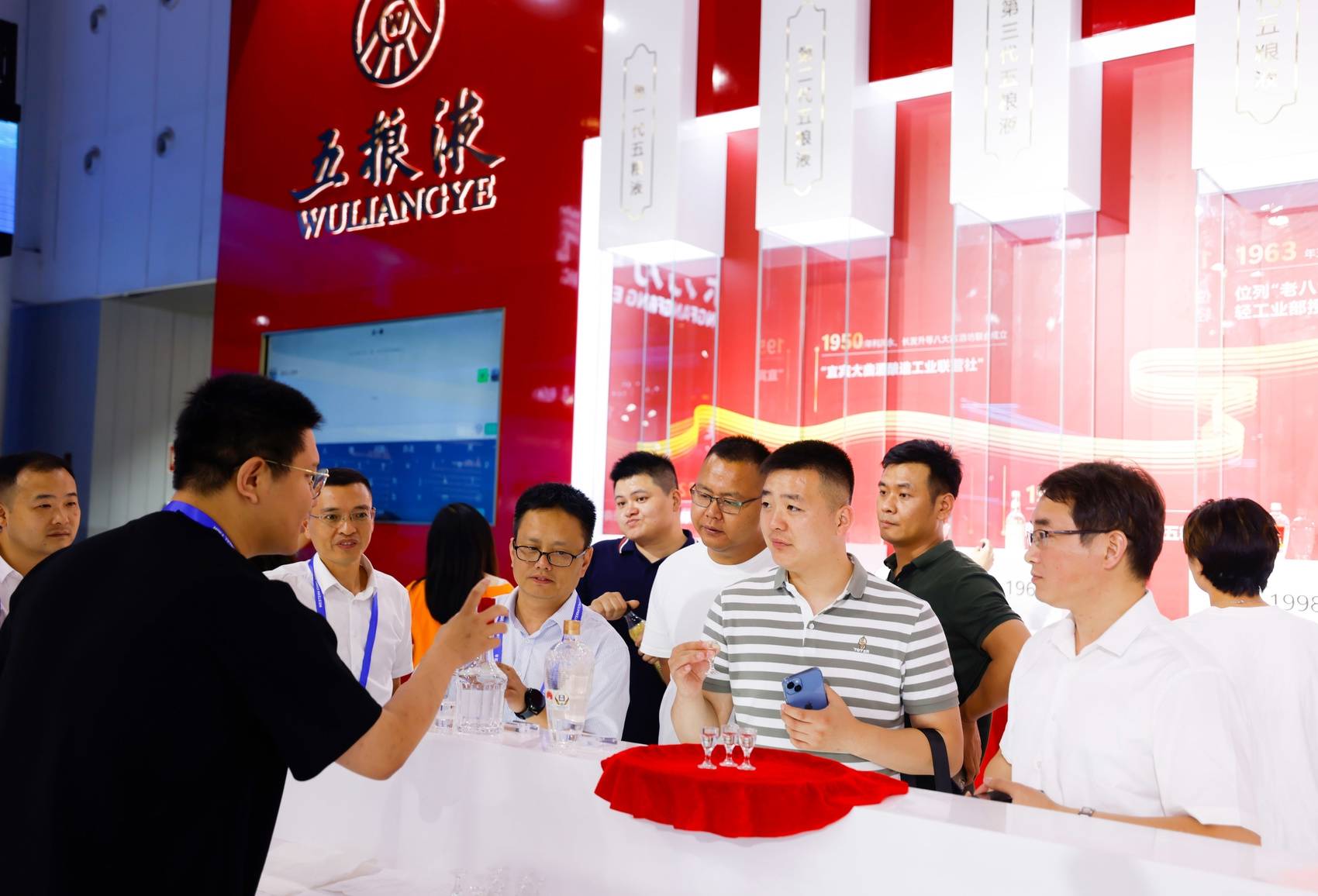 五粮液展台前熙来攘往,不少嘉宾带着浓厚的兴趣来此品一杯“大国浓香”,入口甘醇、回味悠长。