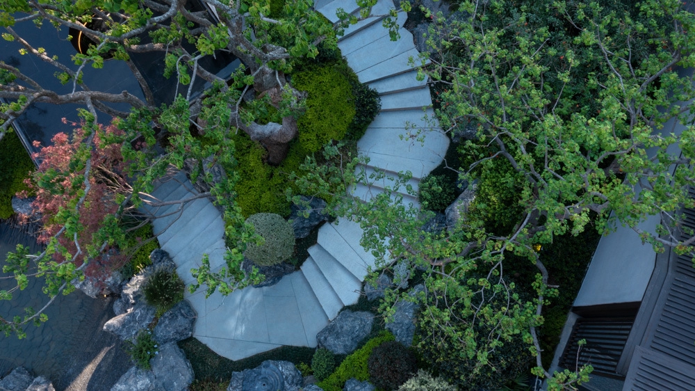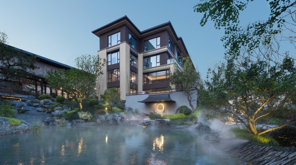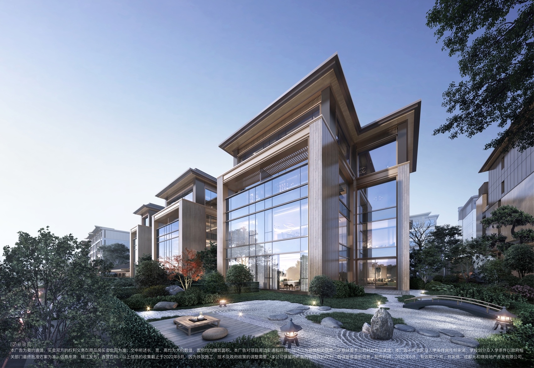 建发天府养云项目中的6栋墅式建筑,沿东南弧线一字排开,直面近距离的白鹭湾湿地公园。养云院子产品,采用约6米挑高、最大约8米面宽设计。养云东南侧拥有天然的地势高差,形成层层退台的高低布局,更是让合院/叠院的景观与视野实现了最大化。
