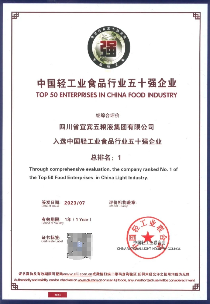 五粮液上榜2022“中国轻工业食品行业五十强企业”榜单