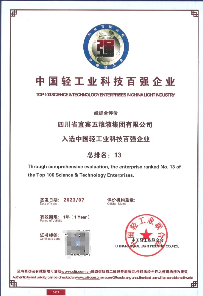 “中国轻工业科技百强企业”是践行科技兴国战略的先进典型,是引领中国轻工业科技创新的领军力量,此次统计评价以申报企业2022年度的研发投入、研发投入占营业收入比重、重点实验室数量、科技成果数量、科技奖项数量、专利数量、专利奖项数量、制定行业标准数量、参加重大科技项目数量九项指标为依据。据了解,目前五粮液拥有8个省部级重点实验室及工程技术研究中心,国际领先科技成果5项、国内领先科技成果2项,参与国家级重大科技项目2个、省部级重大科技项目51个,获国家级科技奖2个、省部级科技奖135个。