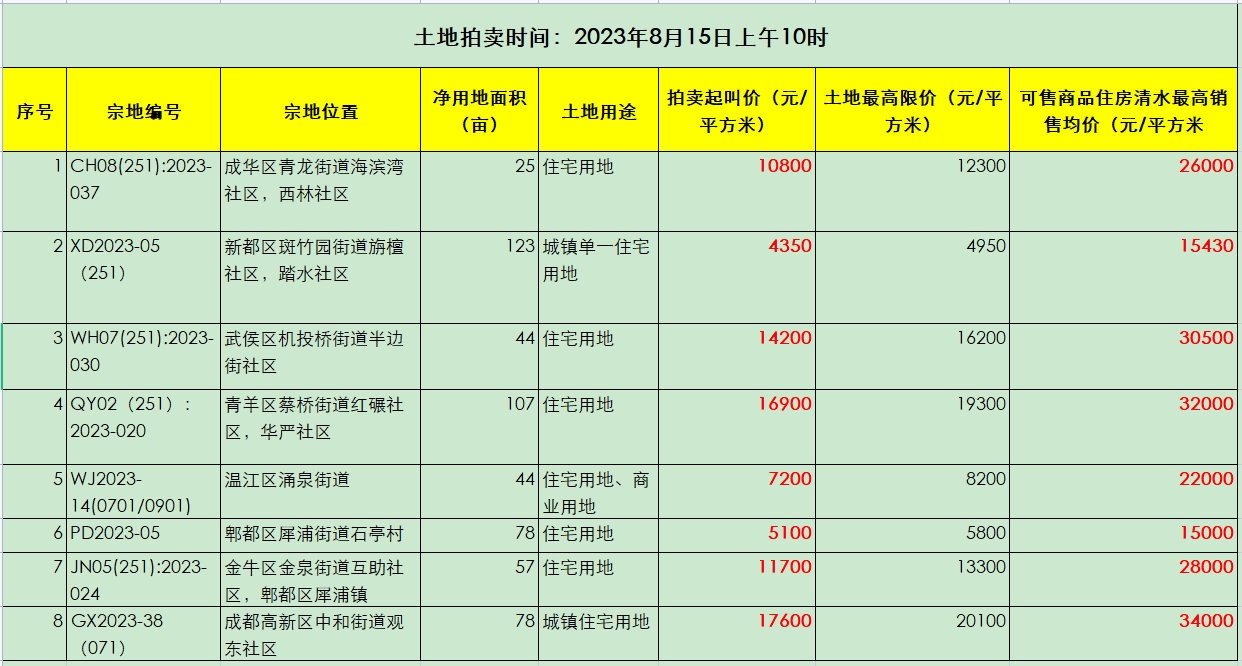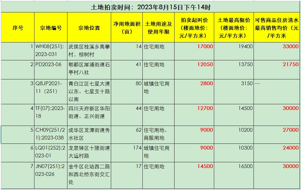 7月20日,成都市公共资源交易中心发布最新土拍公告,将于8月15日拍卖出让15宗宅地,合计面积约988亩,将于8月15日10时和14时举行。