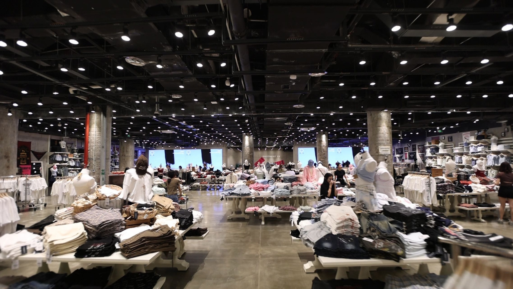 现场陈列按照颜色、风格、类别等分类,3000至5000种单品按照“仓储风”陈列开来,风格多为潮牌、时尚、街头、复古、休闲等多元化特色为主。据介绍,这样的产品开发设计,基于迎合95后、00后新一代年轻消费群体的消费期待,力求与他们产生共鸣。
