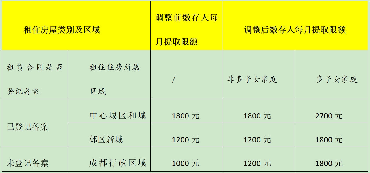 在《关于调整成都住房公积金有关政策的通知(征求意见稿)》中,主要涉及支持租住住房提取公积金调整、支持老旧小区加装电梯提取公积金和深化区域公积金提取互认三个方面。如缴存人租住住房为未登记备案的,每月租房提取公积金限额由1000元拟调整为1200元,每年累计提取金额不超过1.44万元。租赁合同已登记备案的按照此前政策执行不变。另外,多子女家庭(指至少有一个未成年子女的二孩及以上家庭)租房提取额度在同期提取政策规定的额度基础上,再上浮50%。