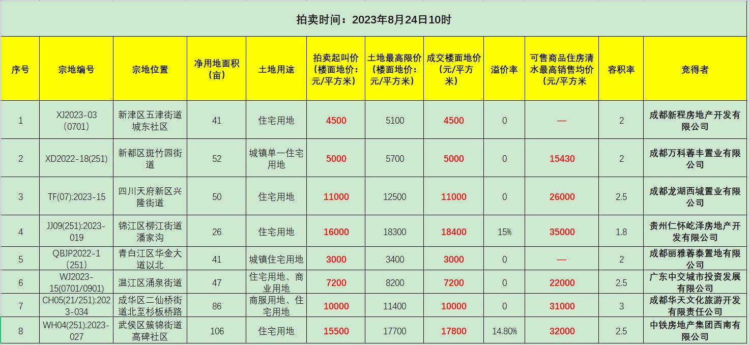 此外,金牛区国宾板块清水限价36000元/㎡的58亩纯住宅地块被城投置地底价拿下,天府新区兴隆街道50亩纯住宅地块由龙湖地产底价竞得,万科地产以底价5000元/㎡摘得新都斑竹园52亩纯住宅用地,中交城投以底价拿下温江涌泉街道47亩和新都三河街道75亩两宗纯住宅用地。