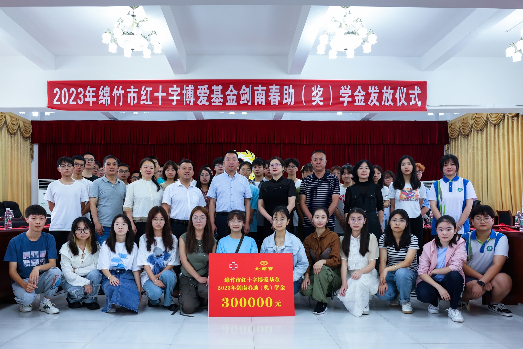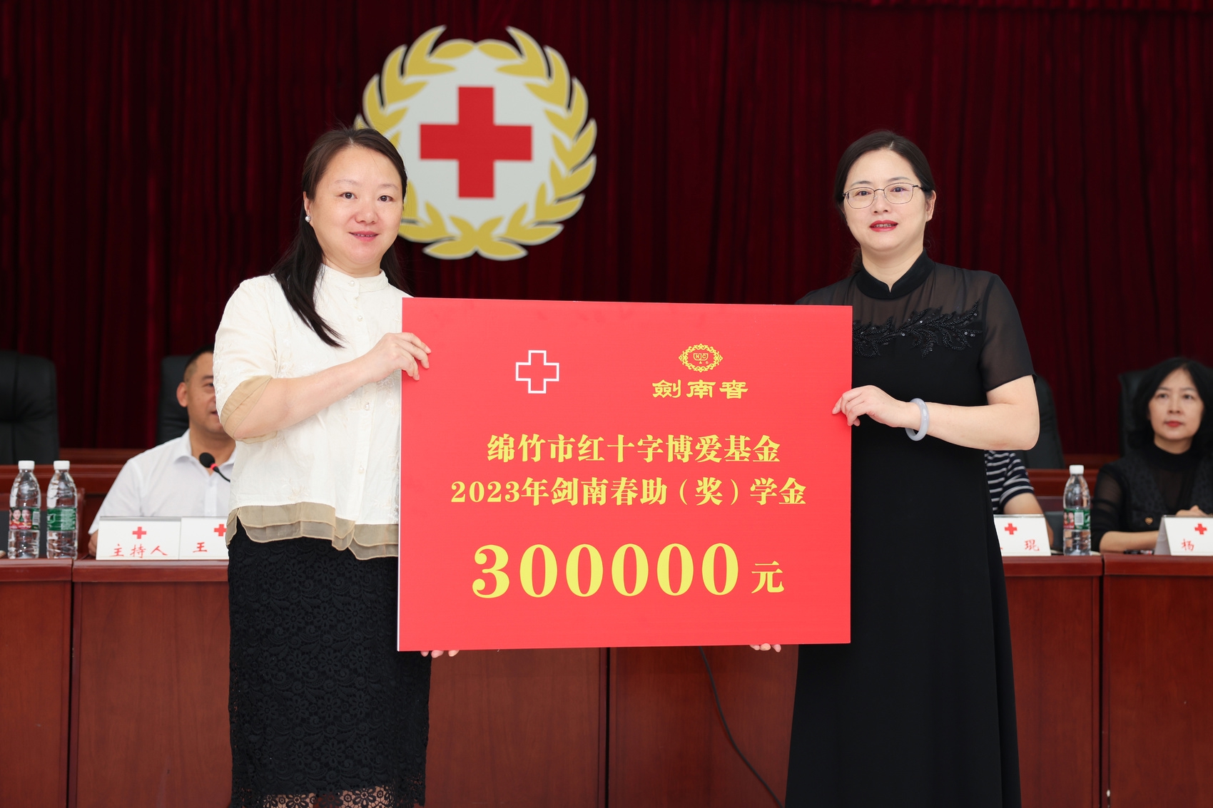 8月25日,2023年绵竹市红十字博爱基金剑南春助(奖)学金发放仪式在绵竹市红十字会举行,绵竹市60名优秀准大学生收到剑南春集团爱心资助款项共计30万元。四川剑南春集团有限责任公司工会主席王剑向绵竹市红十字会授予助(奖)学金捐赠牌。