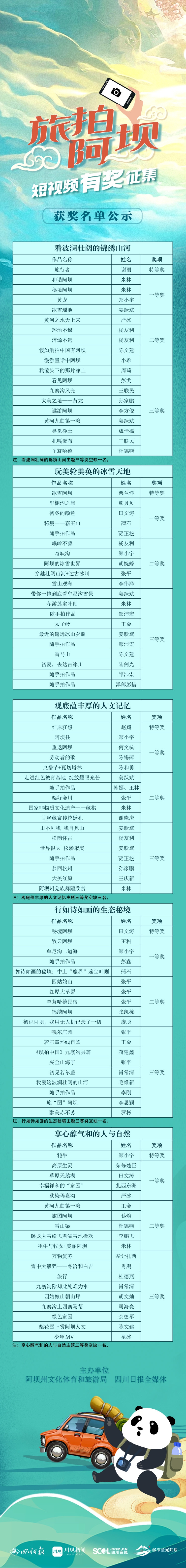 访熊猫家园,拍净土阿坝。由阿坝州文化体育和旅游局、四川日报全媒体联合主办的“旅拍阿坝”短视频有奖征集活动历经5个多月的全网征集与评选,8月25日,评选出的近150个短视频作品进入公示阶段,拟发放奖金近30万元。其中,五大主题榜单包含94个获奖作品,另有34个短视频作品获评优秀奖。