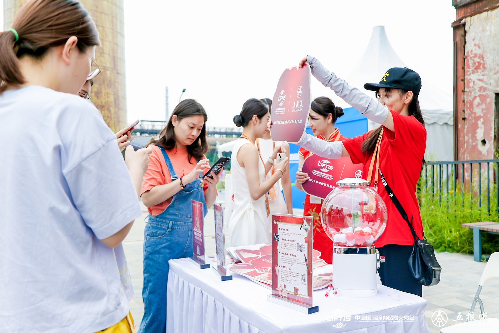 在国家会议中心的五粮液展厅内,手持大会KT版打卡集赞的逛展观众们络绎不绝,印有五粮液品牌logo、服贸会标志的帆布袋、日志本、遮阳伞、笔记本等好礼备受观众喜爱。