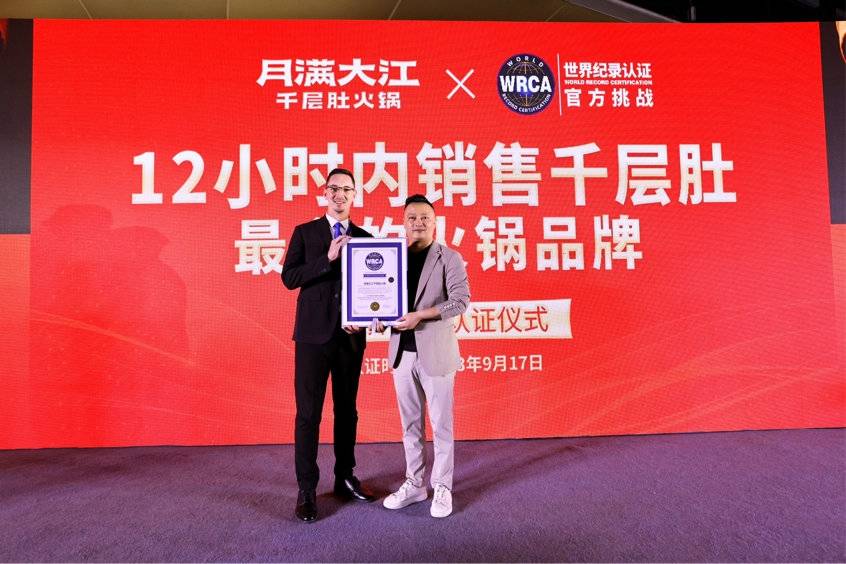 9月17日,月满大江千层肚火锅通过世界纪录认证(WRCA),在12小时内售出11593份千层肚,成功创造“12小时内销售千层肚最多的火锅品牌”世界记录。