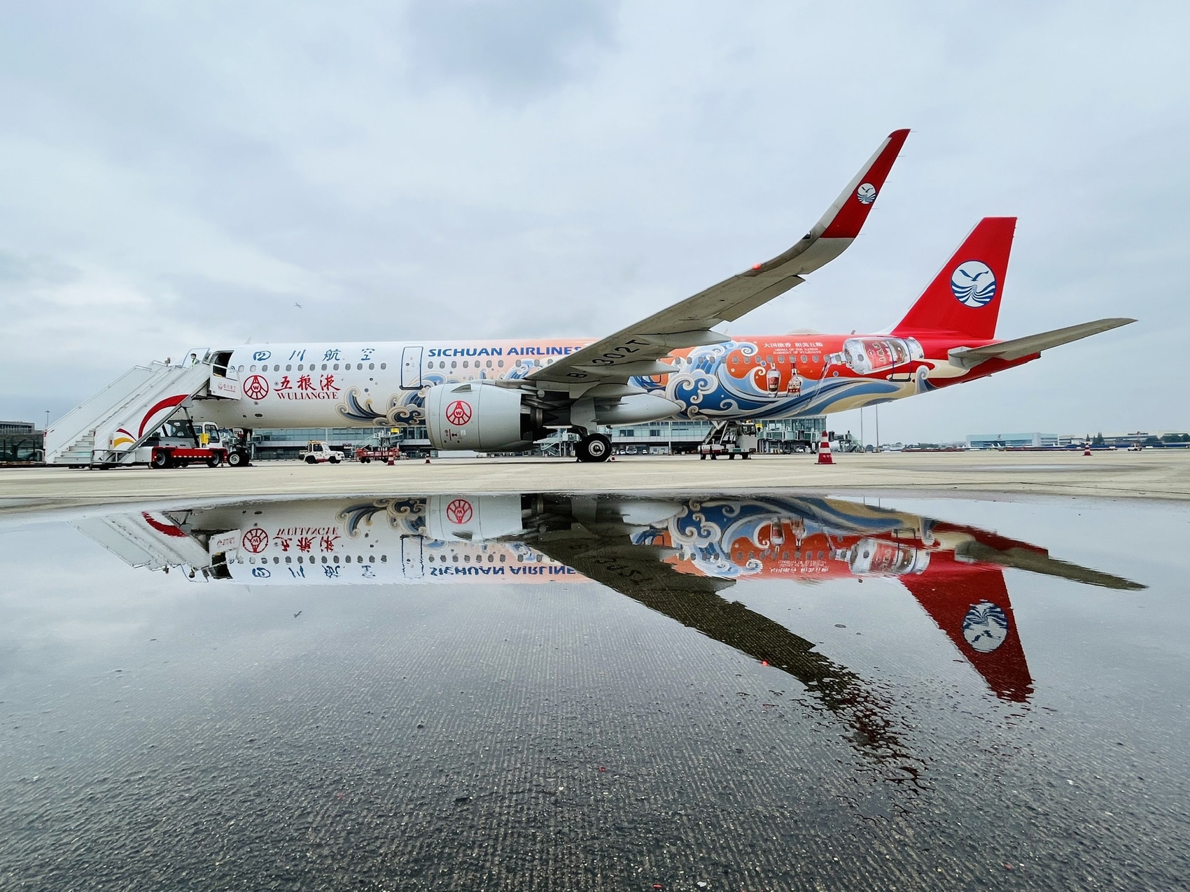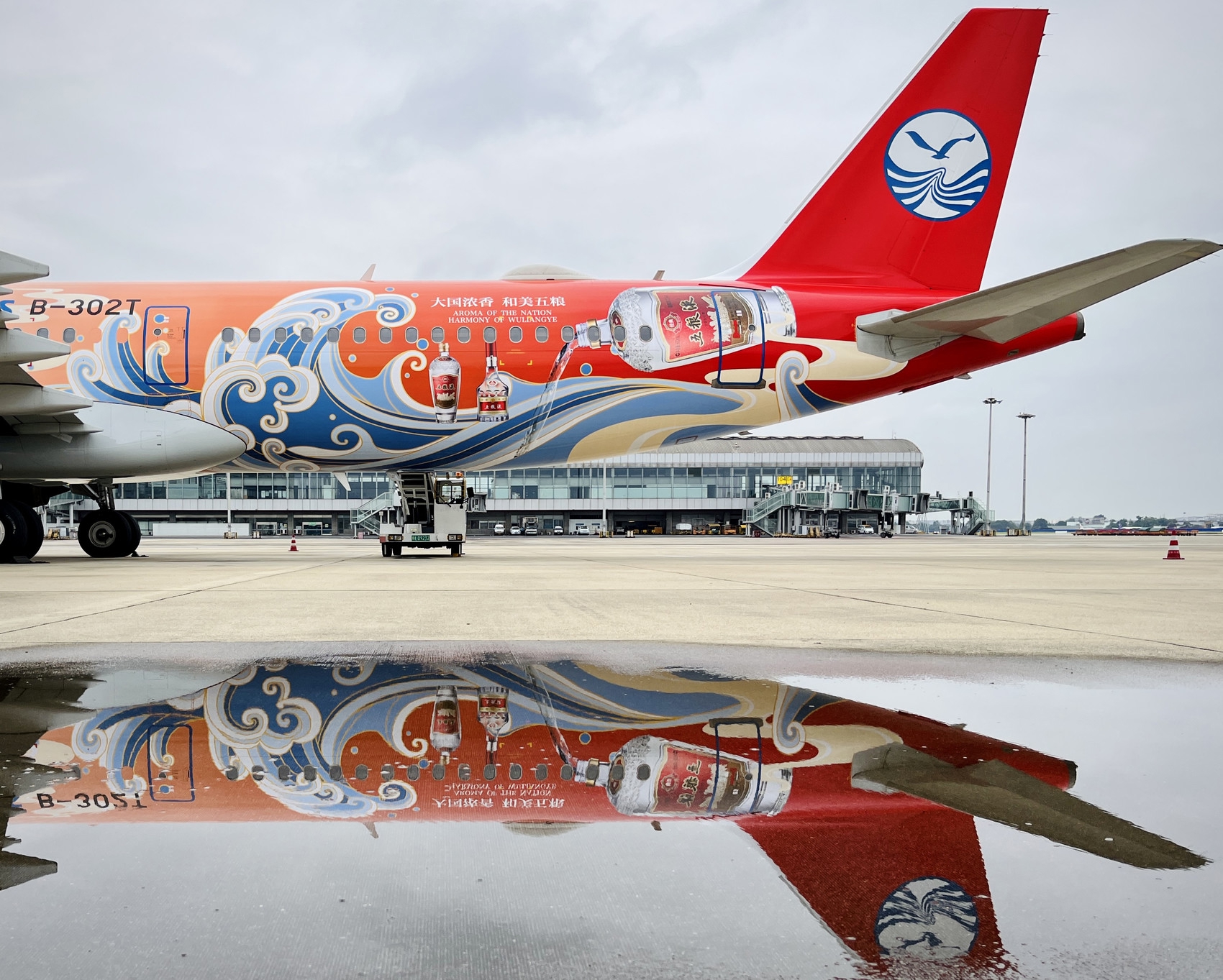 据介绍,本次五粮液和四川航空联合推出的主题航班一共五架飞机,24日首飞的是A321五粮液号。这架飞机在外观上进行了中秋主题的喷绘,还包括经典五粮液、八代五粮液、“大国浓香 和美五粮”等元素,整体风格大气又喜庆。