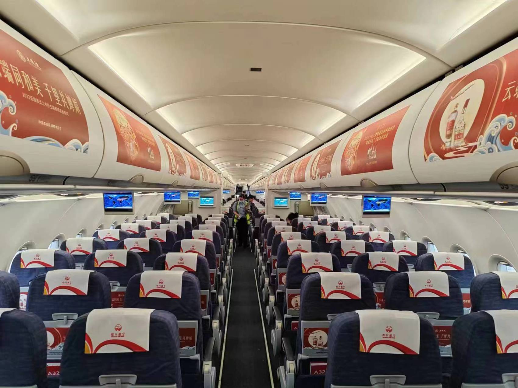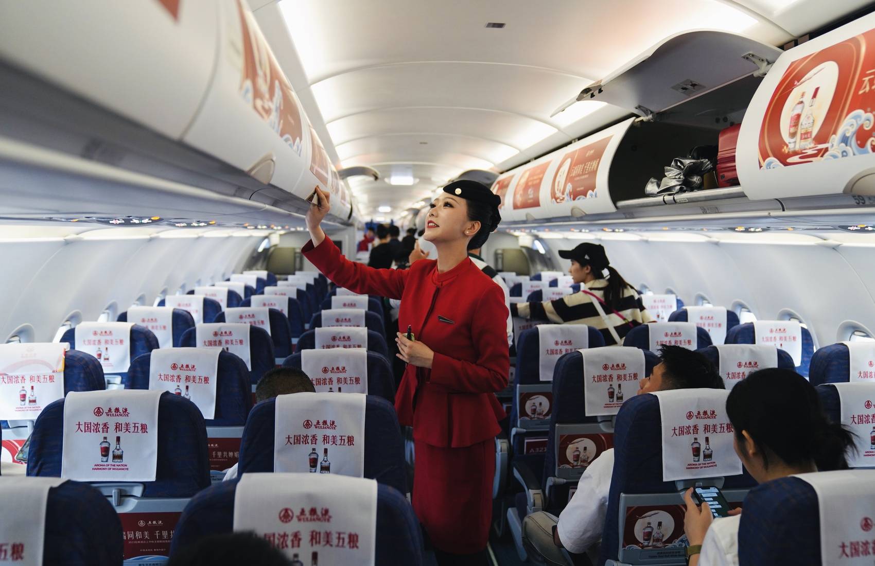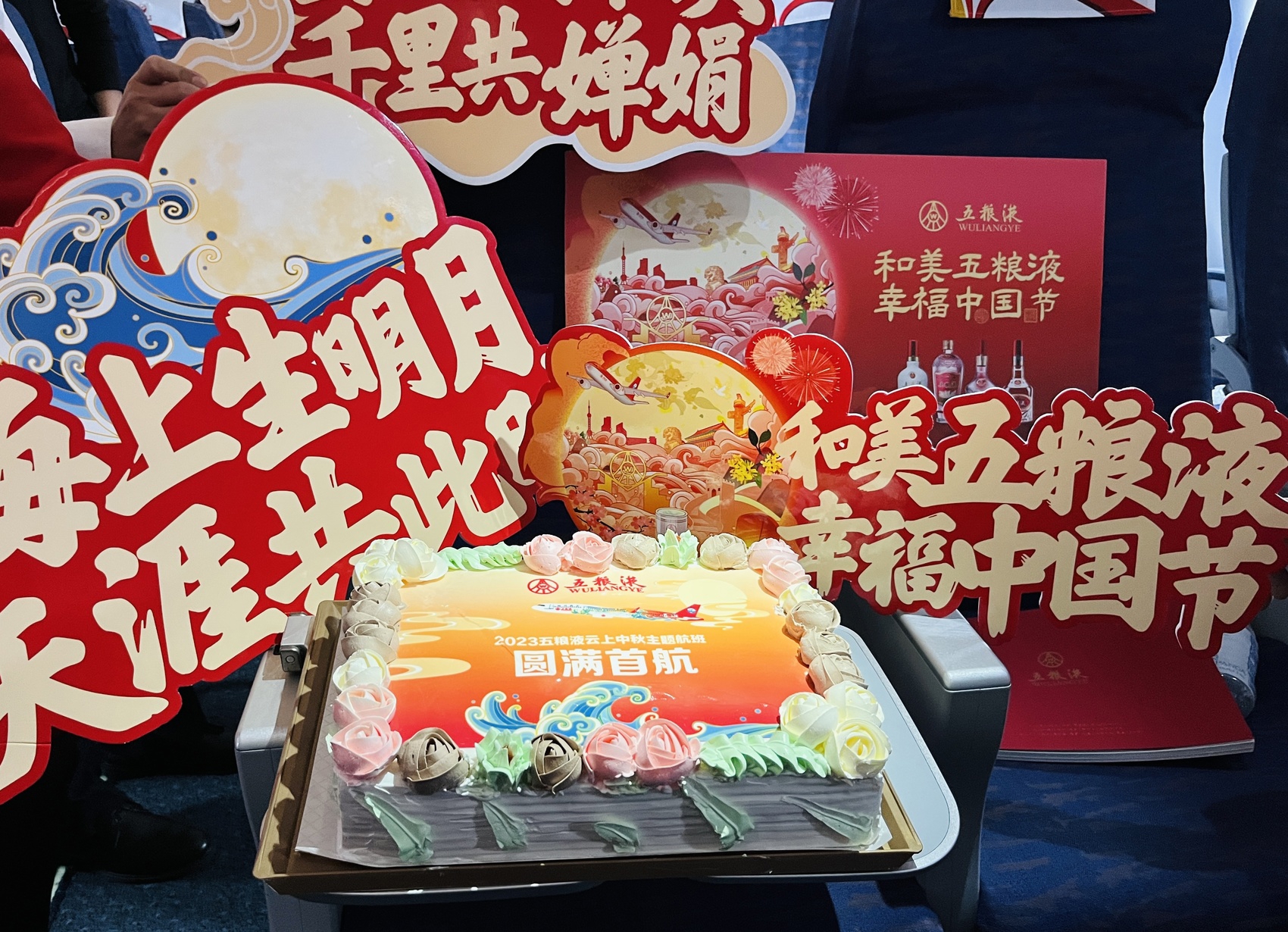 五粮液与四川航空联合推出的中秋主题航班于9月24日首飞。首飞航班飞机上,以红白两个色调为主,这也是五粮液的主打色系。机身上的巨幅中秋主题喷绘,包括了经典五粮液、八代五粮液、“大国浓香、和美五粮 ”等元素,整体风格偏向大气又喜庆的中式审美。在蓝天白云的映衬下,散发着东方特有的韵味。
