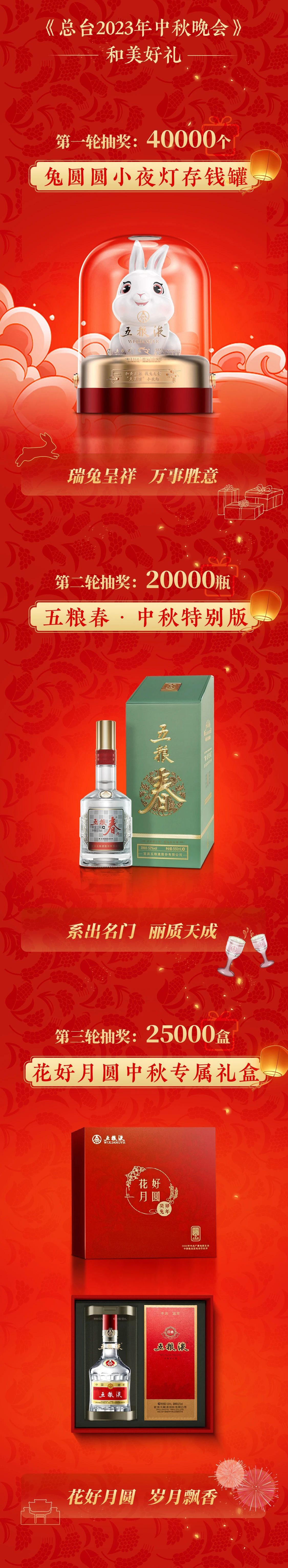 接下来的“重磅戏”,将出现在2023年央视中秋晚会(播出时间20:00—22:00)中,将开展四轮五粮液“和美好礼”互动抽奖: