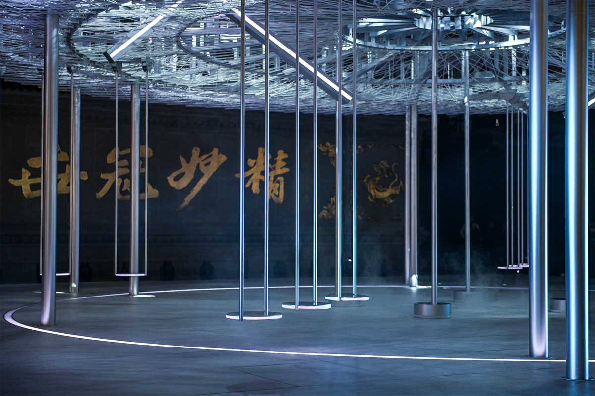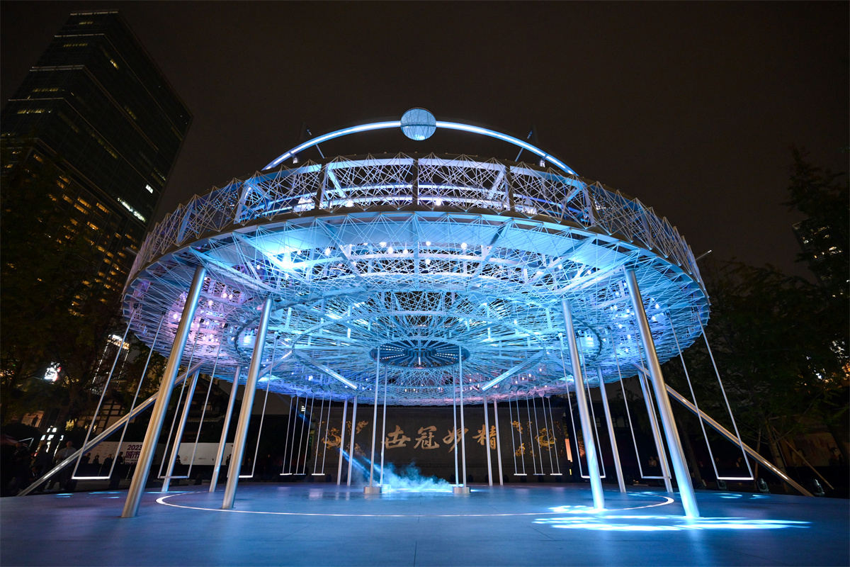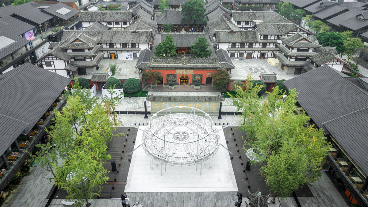 该艺术装置由成都太古里与法国多媒体实验艺术家共同打造,遵循宇宙中的平衡依存法则,采用宏大的编织穹顶与穿插的线条,勾勒出恢弘的美学场景。