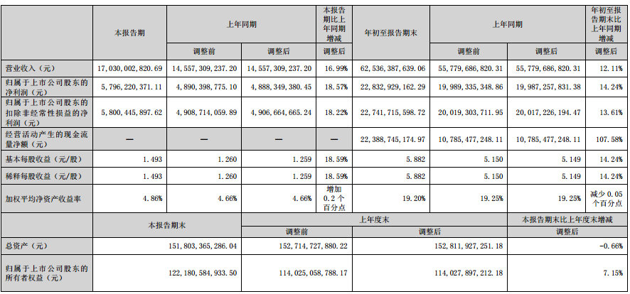 其中,第三季度实现营收170.3亿元,同比增长16.99%;第三季度归属于上市公司股东的净利润57.96亿元,同比增长18.57%。