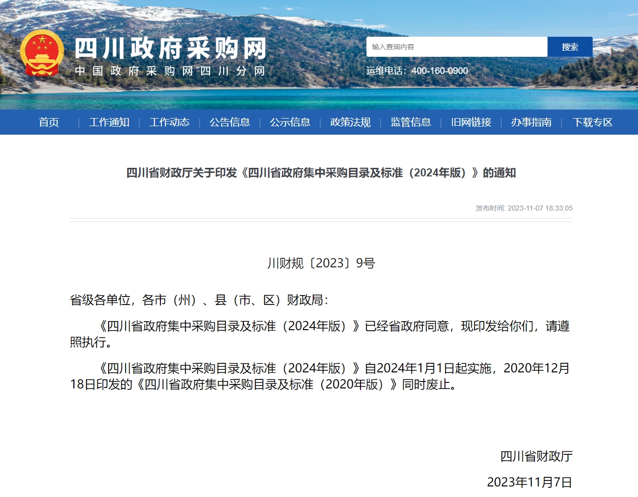 11月8日,记者从四川省财政厅获悉,《四川省政府集中采购目录及标准(2024年版)》现已正式印发,并将自2024年1月1日起实施,2020年12月18日印发的《四川省政府集中采购目录及标准(2020年版)》同时废止。