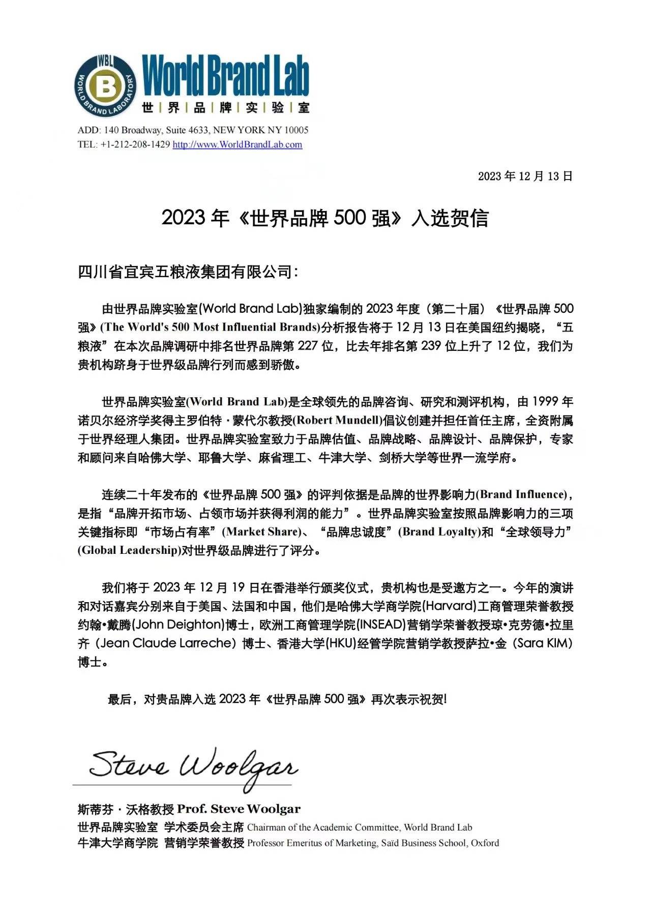 12月13日,2023年中国国际名酒博览会召开前夕,由世界品牌实验室(World Brand Lab)发布的2023年度(第二十届)《世界品牌500强》排行榜揭晓。