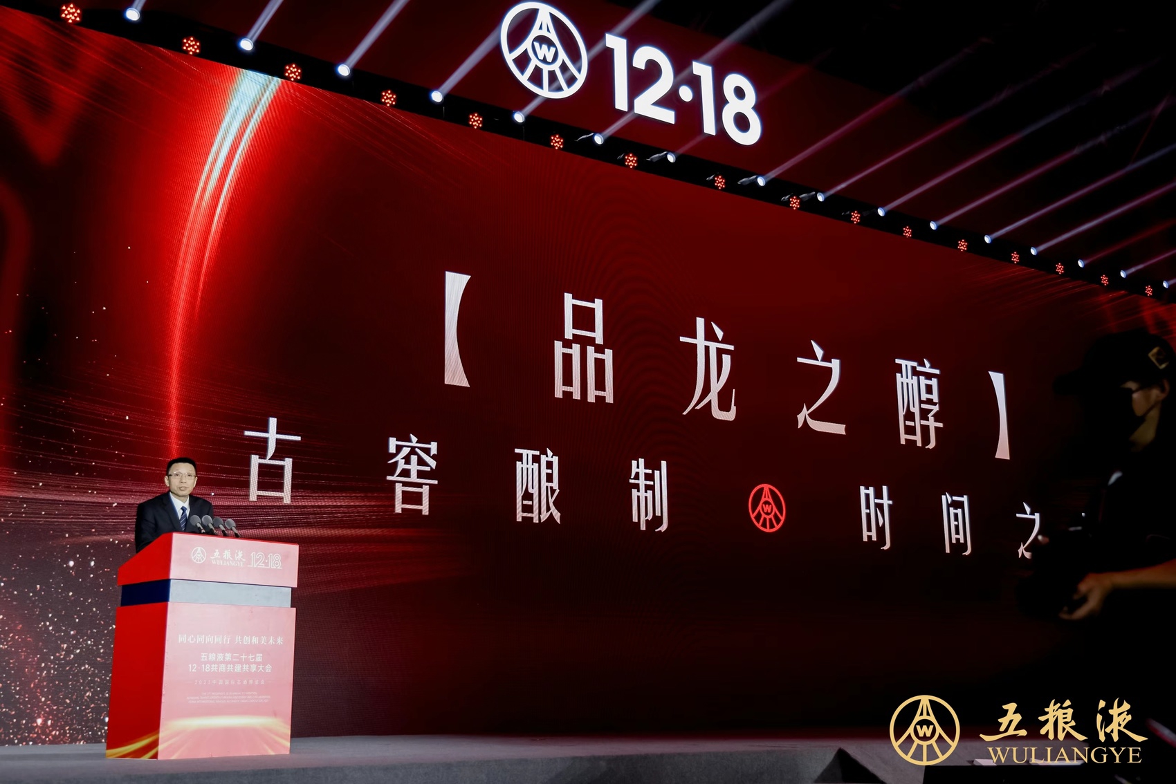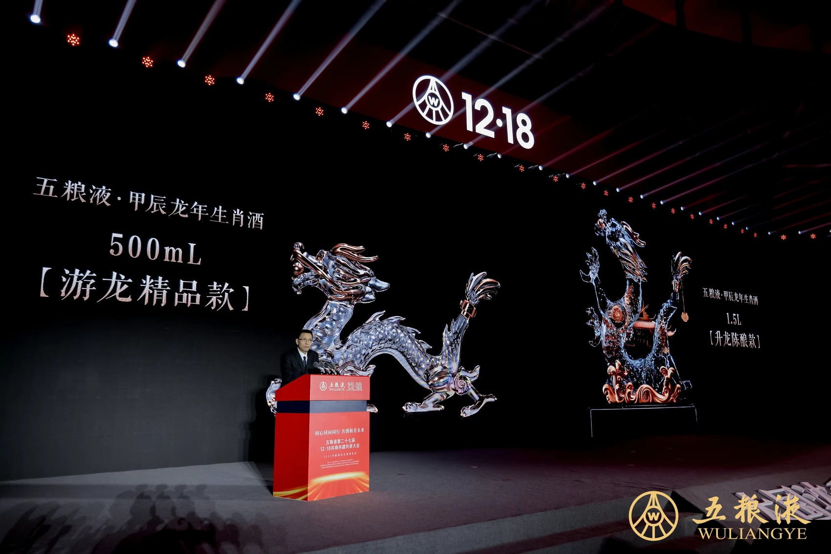 12月18日,以“同心同向同行 共创和美未来”为主题的五粮液第二十七届12·18共商共建共享大会在四川宜宾举行。作为本届大会的重要环节,五粮液·甲辰龙年生肖酒在会上重磅亮相。