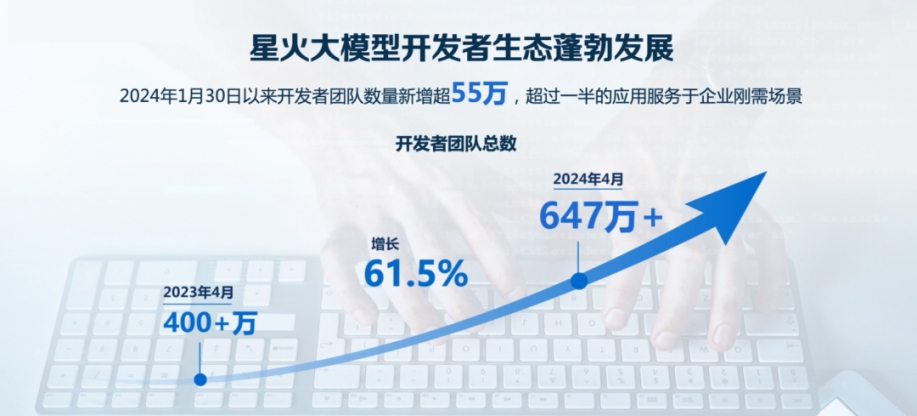 自今年1月30日发布以来,讯飞星火V3.5作为全国首个产算力训练的大模型,受到了广泛欢迎。大模型云边端的整体解决方案正在赋能汽车、家电、运营商等越来越多的行业;不到3个月的时间里,讯飞新增了55万实名认证的开发者,其中一半以上来自企业。