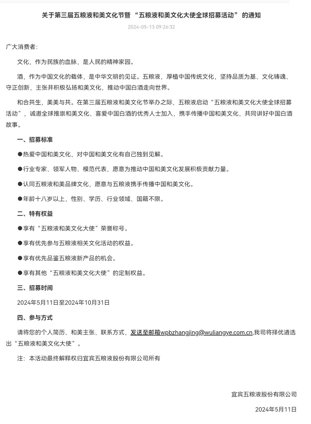 5月13日,五粮液公司官网发布《关于第三届五粮液和美文化节暨 “五粮液和美文化大使全球招募活动” 的通知》,面向广大消费者启动“五粮液和美文化大使全球招募活动”。