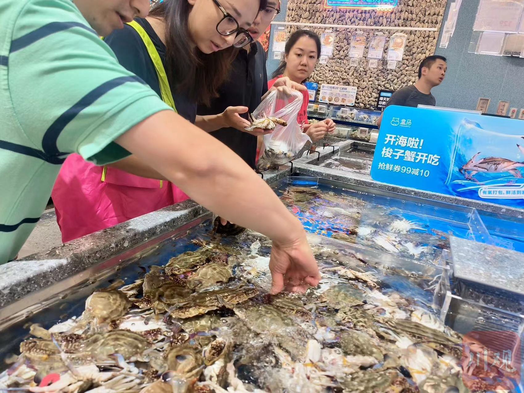 8月4日上午,盒马成都光环购物公园店,来自东海的梭子蟹在成都线下商超正式上架,等候多时的成都市民开始抢购,“性价比很高,69.9元一斤,打卡分享社交媒体还送1斤梭子蟹。”成都市民郑威说。