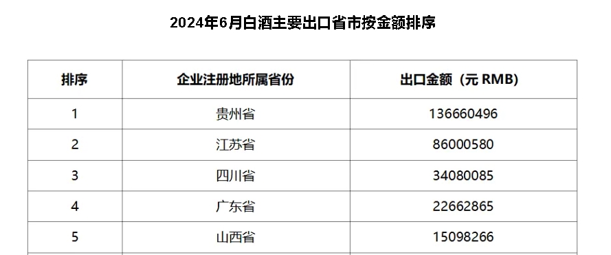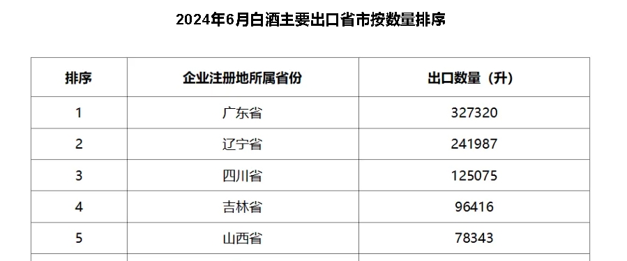 8月4日,中国酒业协会发布上半年酒类进出口信息,该信息援引海关总署统计数据。数据显示,上半年我国白酒出口累计数量7738千升,累计出口额28.74亿元人民币。其中,6月份白酒出口数量1257千升,出口额2.32亿元人民币。四川白酒出口数量125千升,出口金额3408万元人民币,均位居全国第三。
