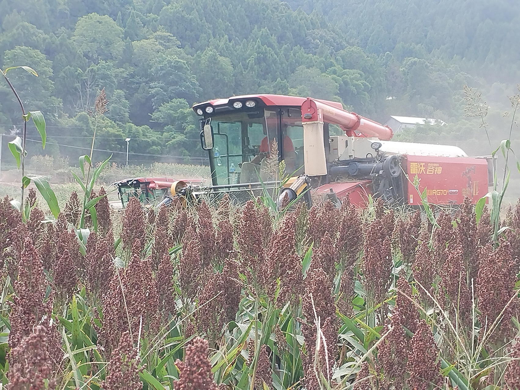 这30多亩高粱的种植方是合江县富益粮贸有限公司,同一天,这家公司分布在射洪、蓬溪等地的酿酒专用粮基地都在进行繁忙收割。“我们一共调用了20台收割机,算是全省范围内最早一批酿酒高粱收割。”赵山源是该公司在射洪片区的负责人,负责种、收、储、售等工作。他告诉记者,今年地里种的高粱品种叫“五粮红”,适合机械化收割,也是适合浓香型白酒酿造的专属品种,基本上就是为舍得酒业量身定制。