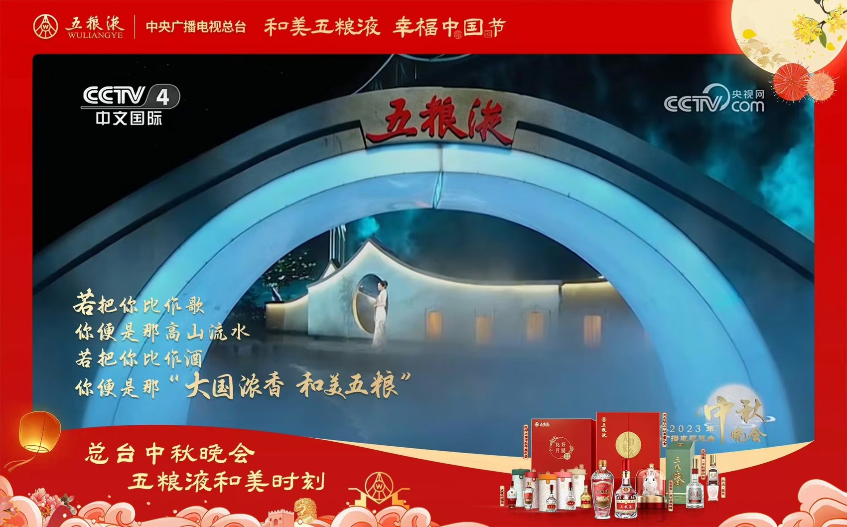 回望2023年,在五粮液的家乡中国宜宾举办的总台中秋晚会中,五粮液作为宜宾最为亮丽的名片深度参与,以互动口播、字幕、互动提示图等多种形式实现“和美好礼”互动提醒,为全球华人送上和美祝福。同时在节目内也以多种丰富形式展现五粮液品牌内涵,以多元化的内容视角对“大国浓香 和美五粮”进行不同层面的展示。
