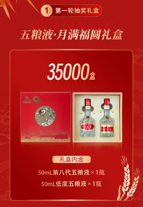 ——第一轮抽奖礼盒,是35000盒五粮液·月满福圆礼盒,每份内含50ml第八代五粮液×1瓶、50ml低度五粮液×1瓶;