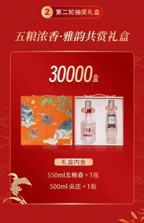 ——第二轮抽奖礼盒,是30000盒五粮液浓香·雅韵共赏鉴礼盒,每份内含550ml五粮春×1瓶、500ml尖庄×1瓶;