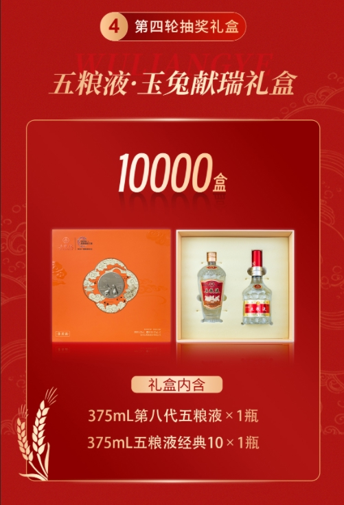 ——第四轮抽奖礼盒,是10000盒五粮液·玉兔献瑞礼盒,每份内含375ml第八代五粮液1瓶,375ml五粮液经典1瓶;