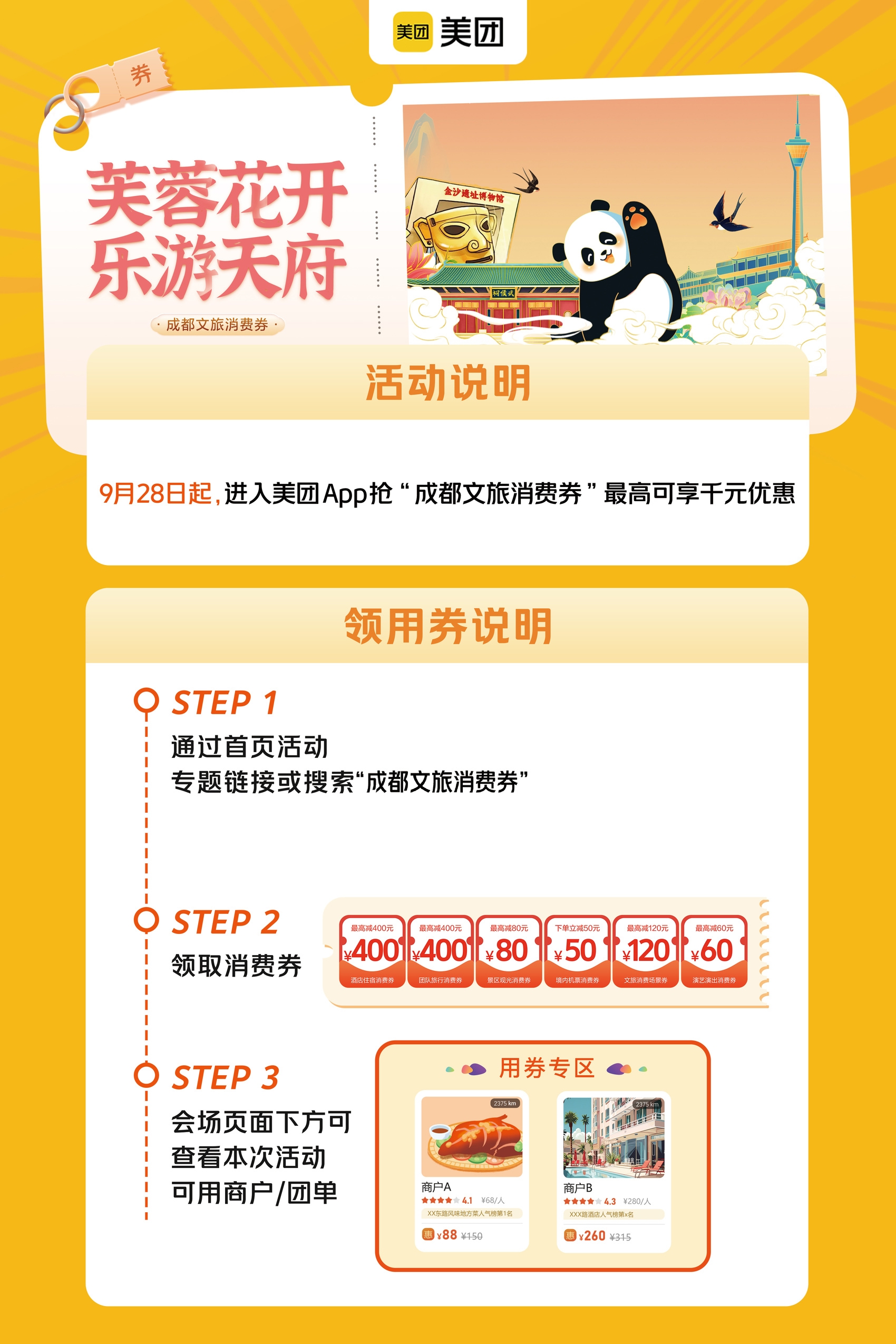 为配合成都市文旅消费券活动,美团将携大众点评等平台配套投入平台补贴,推出叠加优惠活动。在酒店方面,结合国庆+中秋大促,推出“国庆游你定 免单享不停“活动,精准把握用户出行旺季,通过叠加平台红包补贴、抽奖互动、应季好货、商家特惠爆款等内容,提前进行出游场景化引导,激发用户出游欲望。在门票、跟团游和出行方面,推出“中秋国庆超省旅行节”活动,针对必逛景点、特惠出行、经典跟团,联动商家提供各类旅行红包。在演艺演出场景方面,将结合当季节点,策划《了不起的国潮演出》,推荐当地热门音乐剧、话剧、亲子演出、脱口秀等,与演出商家合作,推出特惠9.9元—99元爆款“秒杀”供给,吸引更多用户关注和购买,增加用户的参与度和期待感。