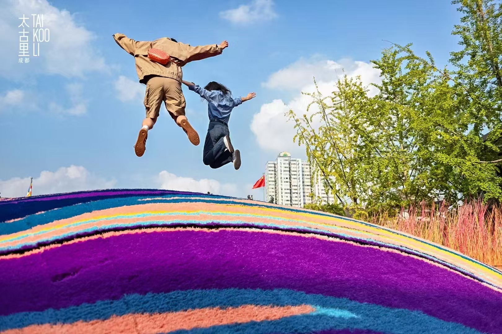 “在有着浓郁成都特色的开放式商业街区中,呈现这般规模的巨型‘露天蹦蹦床’,极具互动性,很有创意和魅力”……