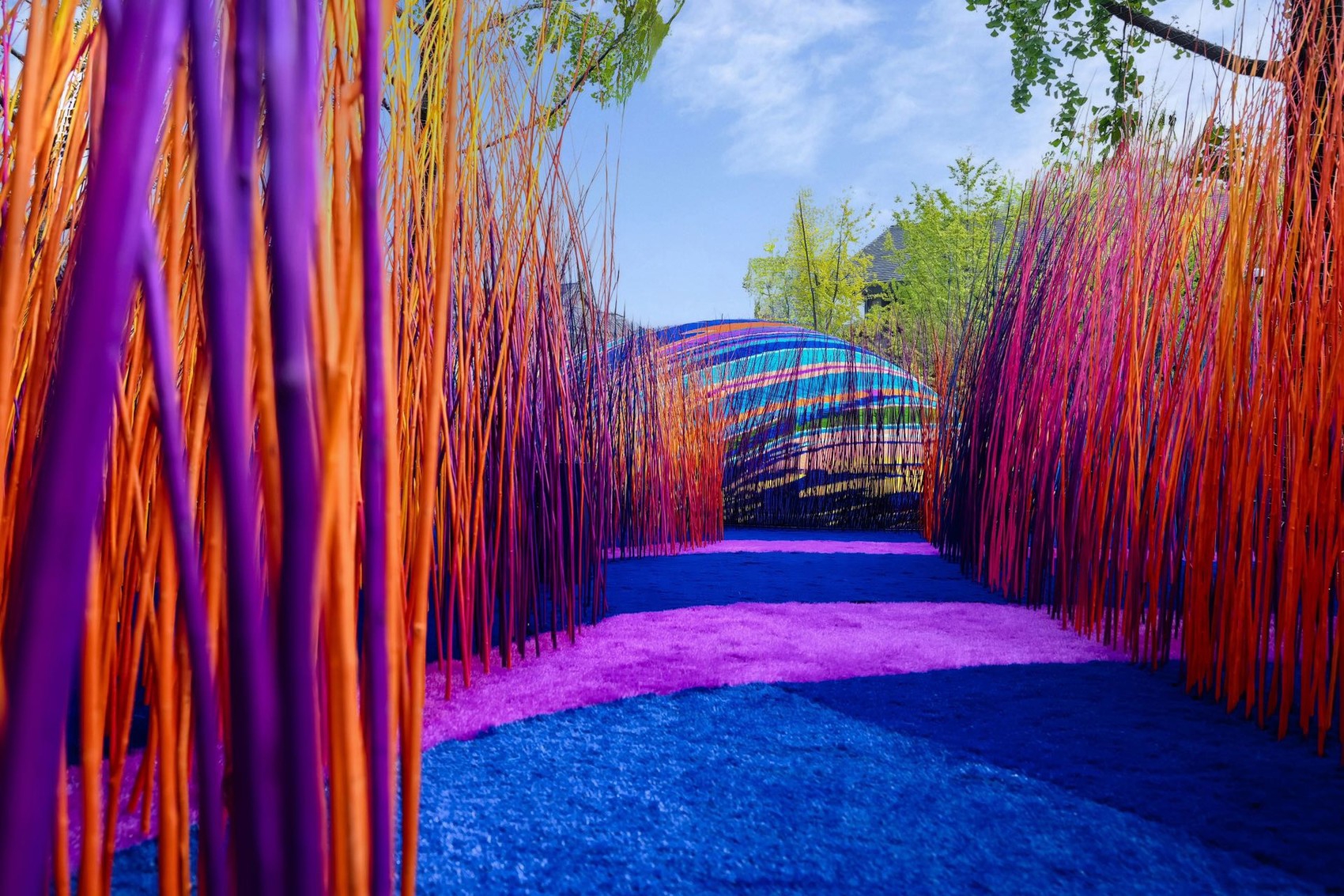 据介绍,公共艺术装置“悦动的山丘”在设计之初就从自然中汲取灵感,在创作过程中更将艺术与环保理念融合,比如,从大自然中取材的杞柳,经过艺术团队的再创造,不仅带来了艺术美感,活动结束后还将被回收制成生物质燃料;草坪部分则采用回收塑料,活动结束后也将被回收利用。