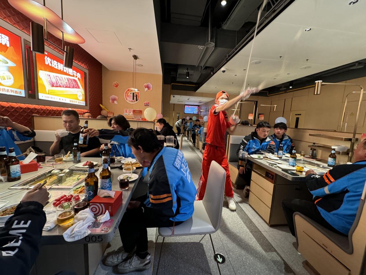 晚上8点,海底捞火锅人民广场店,聚会吃“冬一锅”的顾客逐渐散去,一群身着外卖员冲锋衣的人走了进来。他们受到了海底捞员工的热情迎接,工作人员帮他们卸下厚重的头盔和冲锋衣,递上一条条热毛巾,端上水果和热饮。