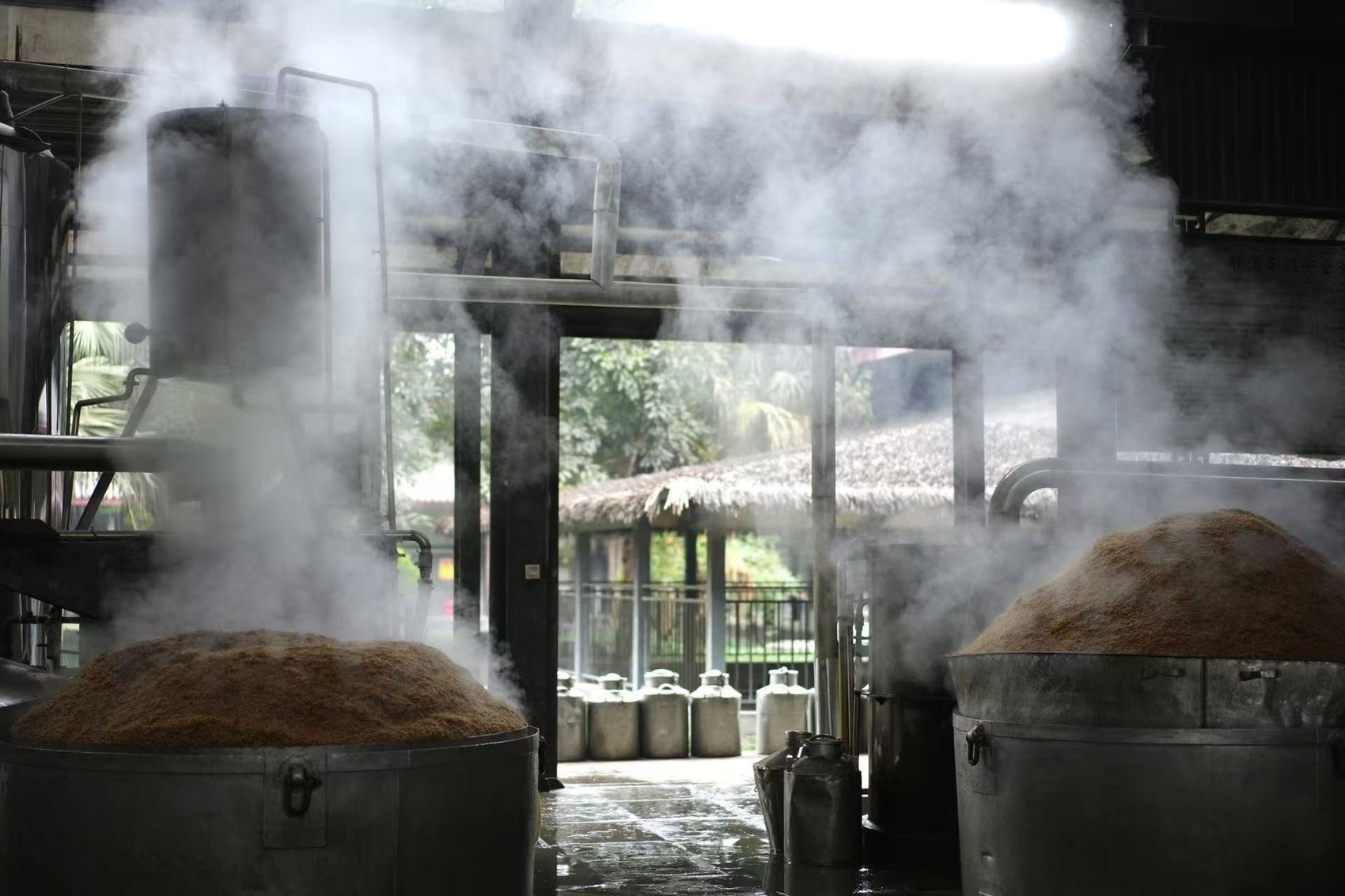 对于酒庄而言,酒是核心和灵魂。进入源窝子酒庄第一站,工作人员张燕便带记者来到酿造车间,酿酒师傅们忙碌有序:白茫茫的蒸汽、不停翻动的酒糟、汩汩涌出的新酒……“我们特地在甑子对面开了一个参观口,车间墙壁也换上大大的玻璃窗,就是为了让来访游客能直观地观赏酿酒的全过程。”张燕说。