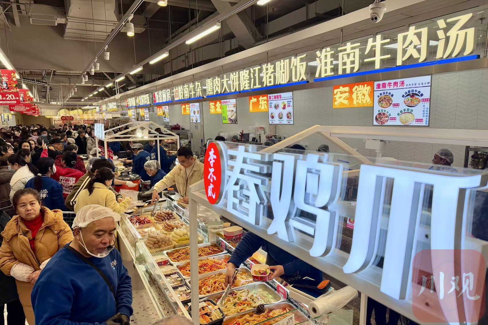 除了网红商品,日常烟火气也是盒马新店极力打造的氛围。记者在成都世茂广场店走访看到,新店开业1小时内,鲜切肉铺旁围满购物顾客,现场服务人员正根据消费者需求现场分割猪肉、羊肉、牛肉;熟食一条街则汇集全国各地美食,包括岭南牛杂、淮南牛肉汤、熏肉大饼等,烟火气十足。市民张女士告诉记者,逛完店还可以在门口顺便选购一束鲜花,“澳洲腊梅、银柳、冬青、小香松……品类太全了。美食满足了口腹之欲,鲜花则能点缀一天的好心情。”