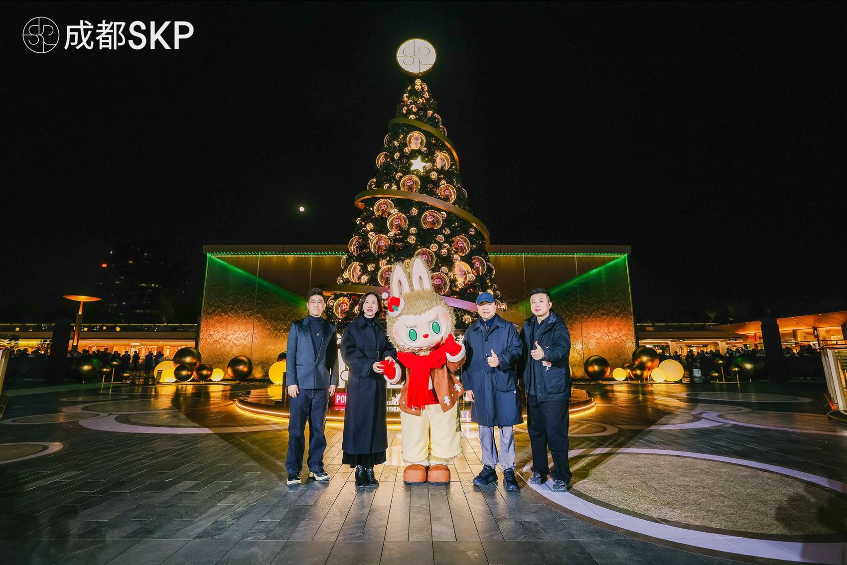 左起:成都SKP店长何海涛、成都SKP常务副总经理李晓晨、成都SKP董事长徐勇、POP MART市场营销总监张晓阳与LABUBU共同见证新年许愿树亮灯
