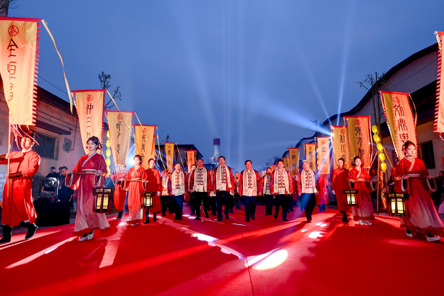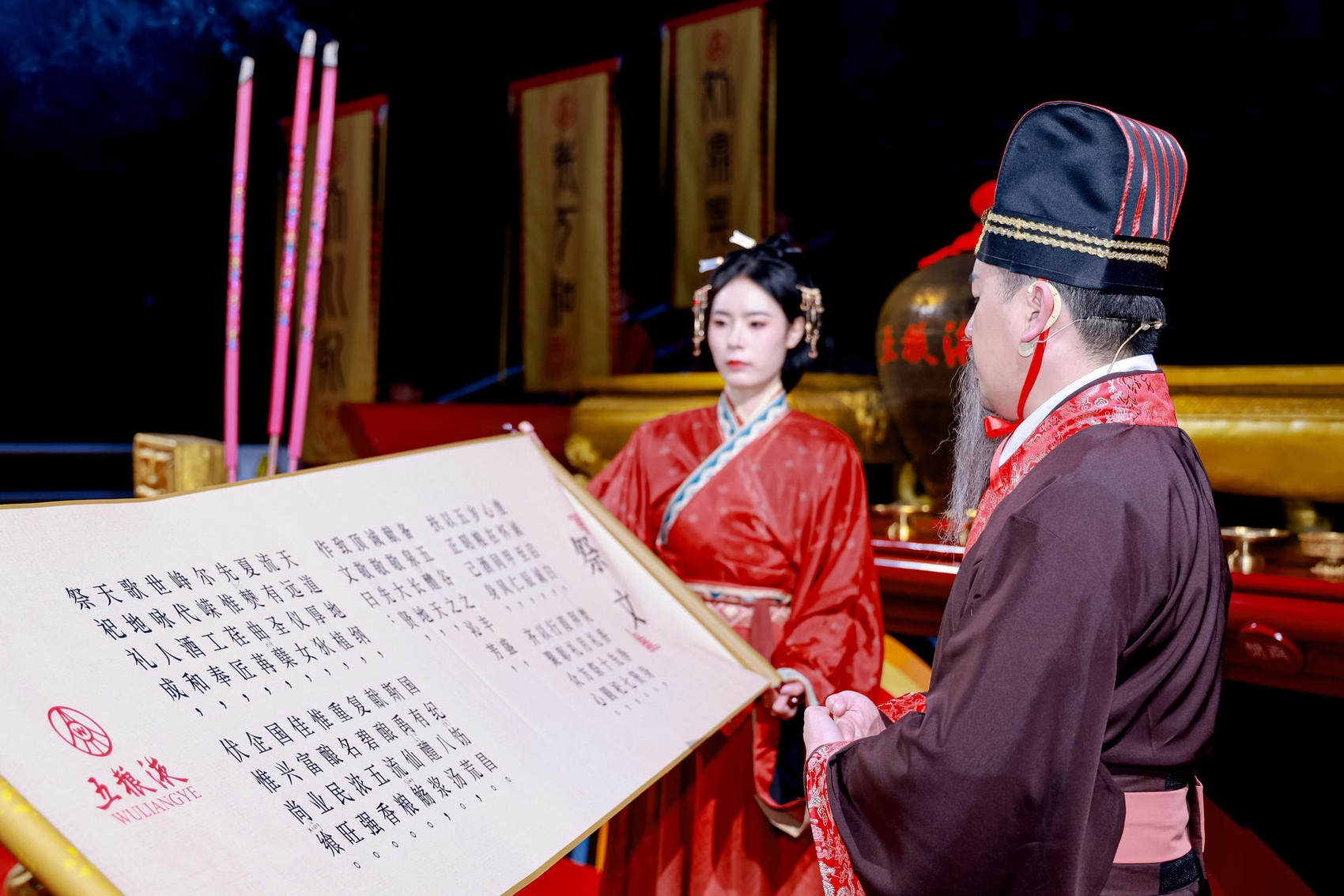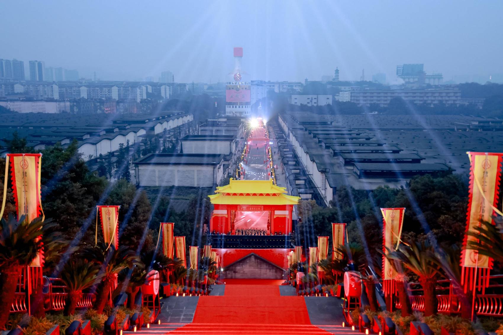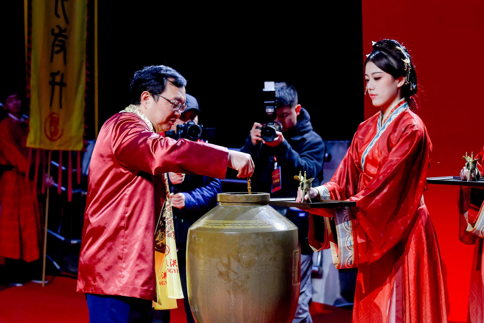 “重碧拈春酒,轻红擘荔枝”,《礼》篇中,杜甫、黄庭坚、苏轼、范成大、陆游五位文学大家“现身”,吟诵历史经典,展现出五粮液深厚的历史文化底蕴与“和美”文化渊源。随着《艺》篇开始,祭祀大典之门开启,一场古韵悠久的乐舞盛宴在嘉宾眼前呈现,五粮液集团(股份)公司党委书记、董事长曾从钦宣布祭祀大典正式开启。