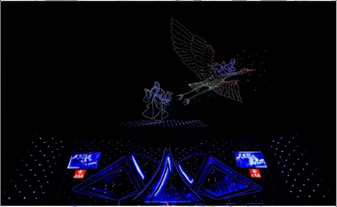 抬头望去,宜宾体育馆上空,上千架无人机组成王勃和李白的形象,从浩瀚的夜空中俯望着大家。随着演员许凯和李光复领诵的声音,现场上万观众深情地朗诵起千古名句,仿佛与千年前的诗词大咖展开了一场跨越时空的对话。
