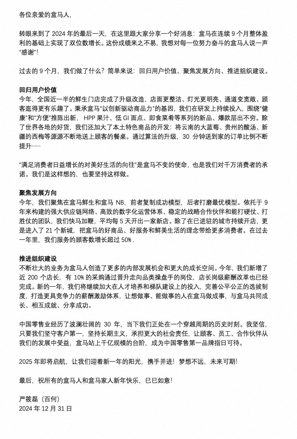 盒马新任CEO发布内部信:连续9个月盈利 实现双位数增长